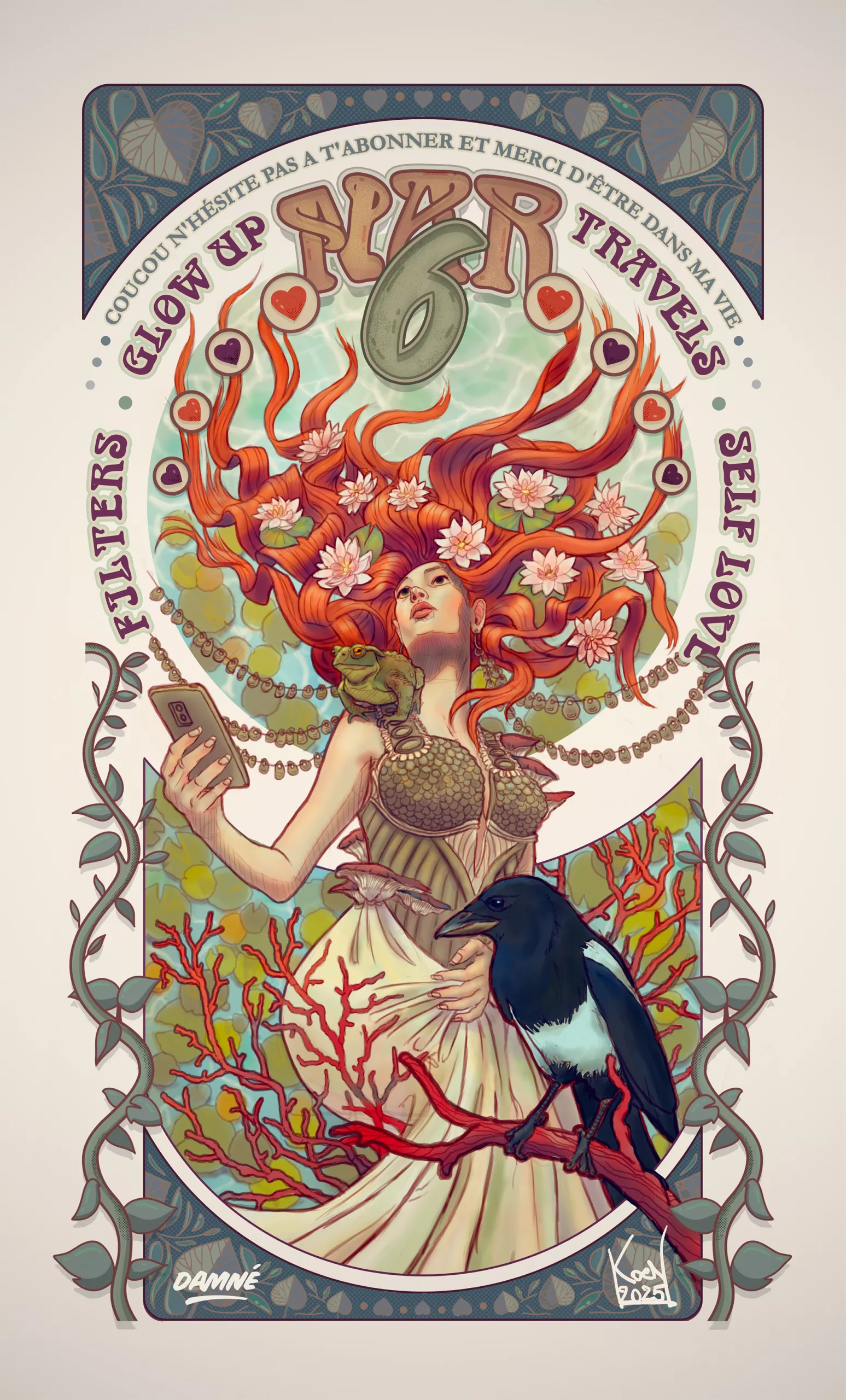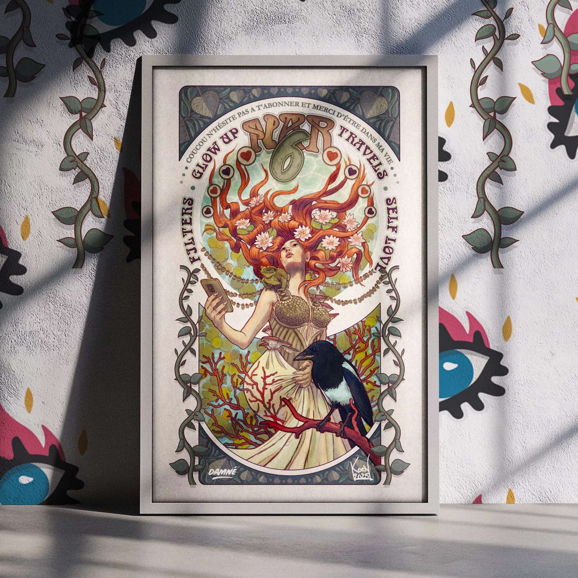 Hommage contemporain à l’esthétique d’Alphonse Mucha, maître de l’Art Nouveau. Cette composition détourne les codes classiques : arabesques, motifs floraux, cadre ornemental… en les mêlant à des symboles actuels. Smartphone, filtres et culture numérique.
